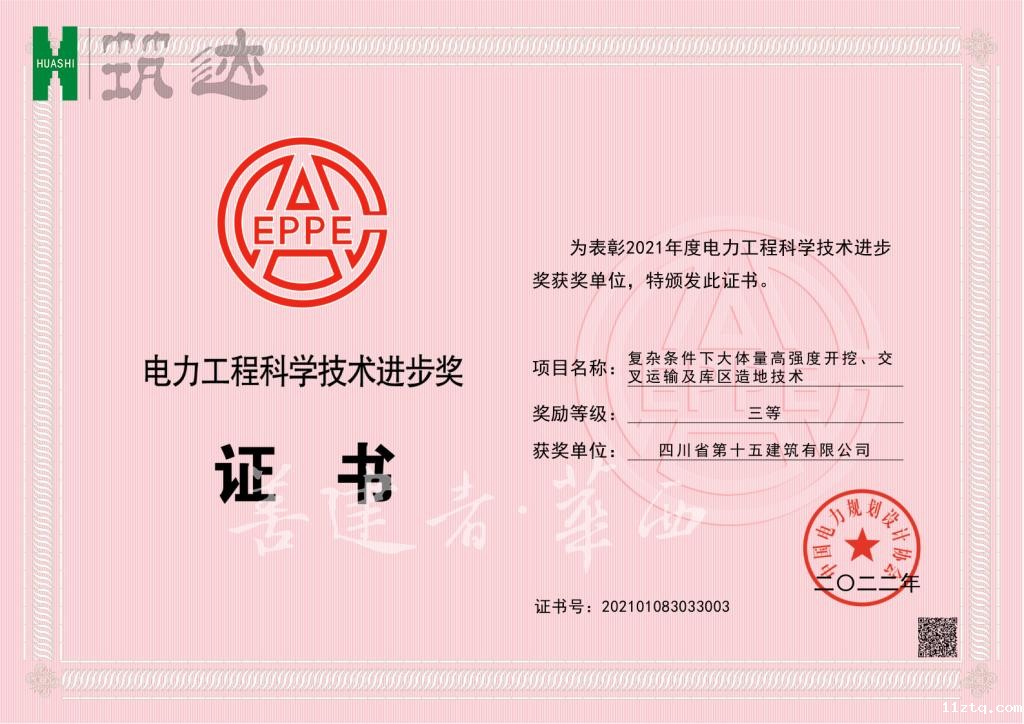 四川十五建与三峡大学、华东勘测设计研究院有限公司联合申报的《复杂条件下大体量高强度开挖、交叉运输及库区造地技术》荣获中国电力规划设计协会颁发的电力工程科学技术进步三等奖。本项研究成果优化了白鹤滩水电站会东县移民工程施工工艺、技术和流程,不仅工期比凉山州政府督导工期缩短2个月,还节约直接工程费用1167万元,获得业主、设计、监理单位的一致好评。同时,“铰链支座卸料平台”“一种建筑墙体防开裂复合结构”“一种新型的连墙件构造”三种实用新型专利申报成功。
